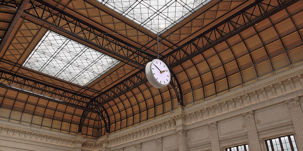 Um auf diese spezifische Anforderung einzugehen, entwickelte Bodet eine individuell konzipierte doppelseitige Uhr für die Haupthalle des Bahnhofs. Diese Uhr im Stunden-Minuten-Sekunden-Format (HMS) mit einem Durchmesser von 2 Metern und einem Gewicht von mehr als 350 kg wurde in unserem Werk im westfranzösischen Trémentines hergestellt und anschließend direkt von unseren Installateuren/Höhenarbeitern im Herzen des Bahnhofs von Bordeaux angebracht. Diese monumentale Uhr hängt inmitten der Halle und ist von jedem Ort innerhalb des Bahnhofs zu sehen. Beidseitig und hintergrundbeleuchtet bietet sie eine optimale Ablesbarkeit unter allen Bedingungen. Die Farbe der Hintergrundbeleuchtung ist je nach Tageszeit unterschiedlich. Auf diese Weise passt sich die Uhr an die Sonneneinstrahlung an. Darüber hinaus wird diese Uhr dank der AFNOR-Technologie mit allen Zeitsystemen des Bahnhofs synchronisiert.